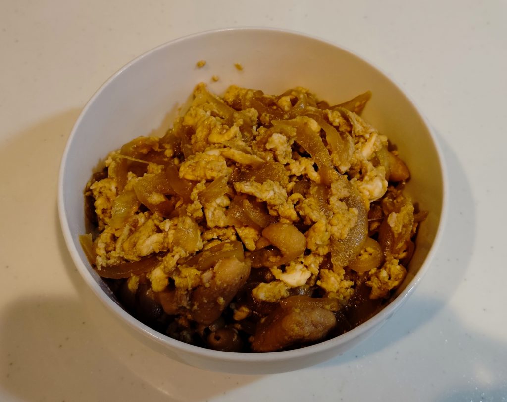 7.卵が半熟状になったら、残りの溶き卵を入れ中火で10秒程加熱し、火からおろしてご飯に盛り付けて完成