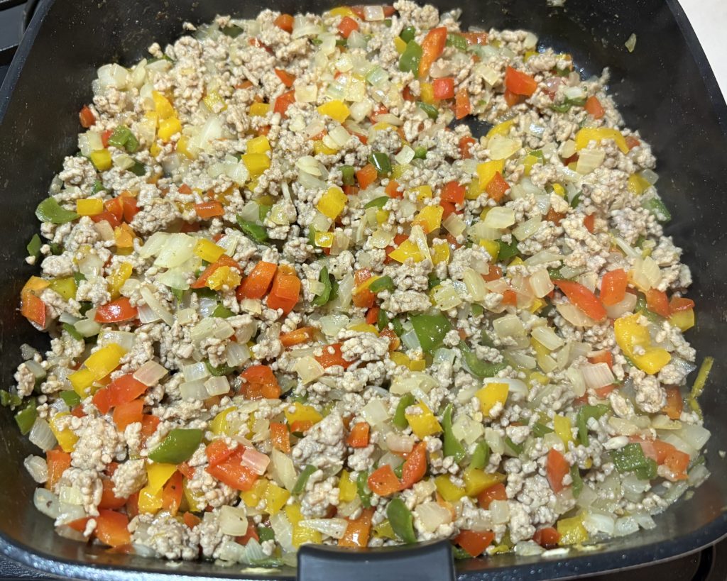 ③ひき肉に火が通ったらみじん切りにした野菜を全て入れて馴染むまで炒めます